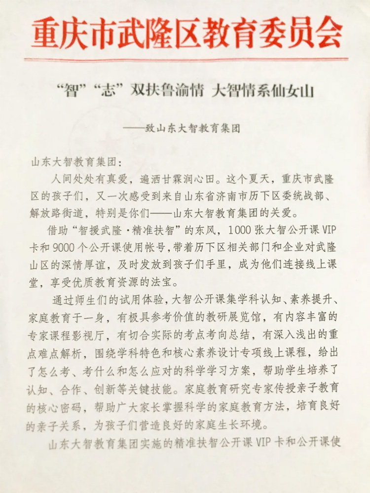 08月24日,重慶市武隆區(qū)教育委員會給大智寫來感謝信,就大智為武隆區(qū)學校公益捐贈大智公開課VIP卡表示感謝。為深入貫徹落實習近平總書記“扶貧...