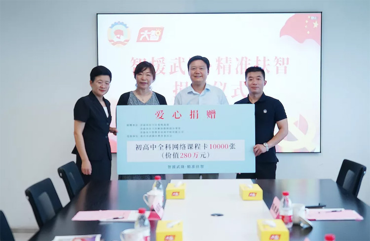 儀式上,大智為歷下區(qū)委統(tǒng)戰(zhàn)部在東西部扶貧協(xié)作中對口幫扶的重慶武隆區(qū)捐贈總價(jià)值280萬元的大智公開課(初高中全科網(wǎng)絡(luò)課程)VIP卡10000張。