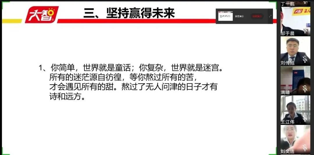 3月25日下午,大智教育集團黨委委員、小班黨支部書記楊愛彬,為大智黨員們帶來“向陽計劃”第三講精彩內(nèi)容分享——《大智助我成長》。部分黨員在現(xiàn)場參加培訓(xùn),其他各區(qū)域(公司)的黨員們通過視頻連線的方式參加培訓(xùn)。