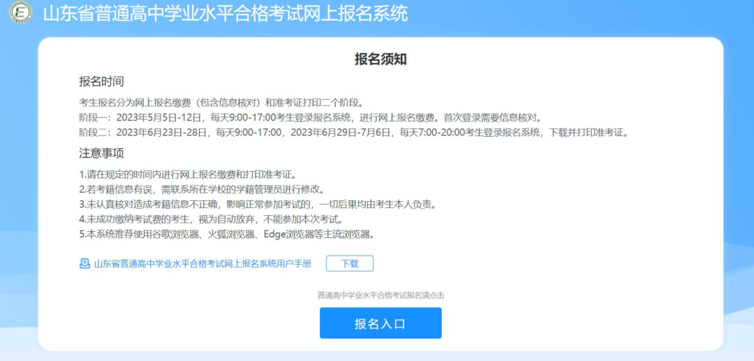 參加山東省2023年冬季普通高中學(xué)業(yè)水平合格考試(以下簡(jiǎn)稱冬季合格考)的考生須于10月19日—26日每天9:00—17:00,登錄報(bào)名系統(tǒng)進(jìn)行信息核對(duì),信息核對(duì)無誤后直接進(jìn)行網(wǎng)上選科繳費(fèi)。繳費(fèi)成功方視為報(bào)名完成,否則視為未報(bào)名成功,不能參加本次考試。