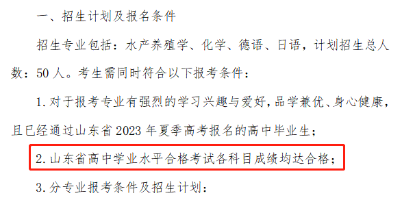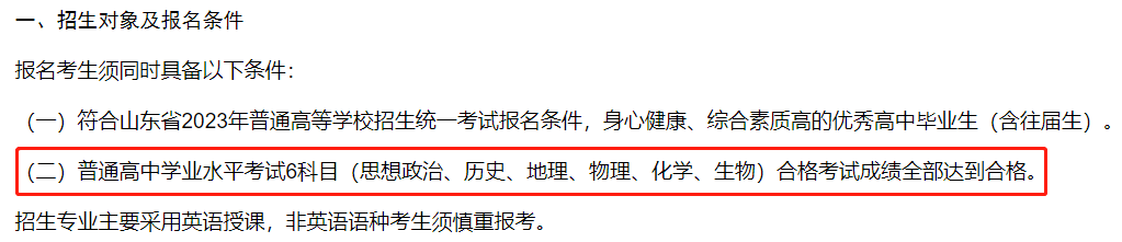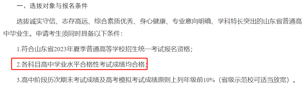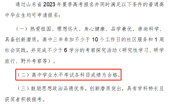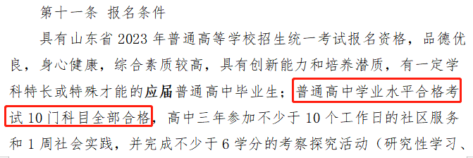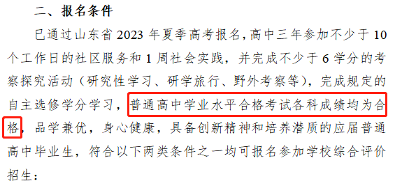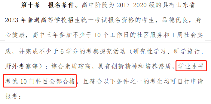 ?青島大學(xué):在2023年綜合評(píng)價(jià)招生的報(bào)名條件中有明確的規(guī)定,普通高中學(xué)業(yè)水平合格考試10門科目全部合格。