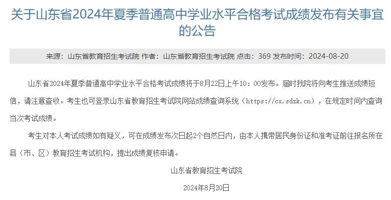 山東省2024年夏季普通高中學業(yè)水平合格考試成績于8月22日(今日)10:00發(fā)布??忌傻卿浬綎|省教育招生考試院網(wǎng)站(https://ww...