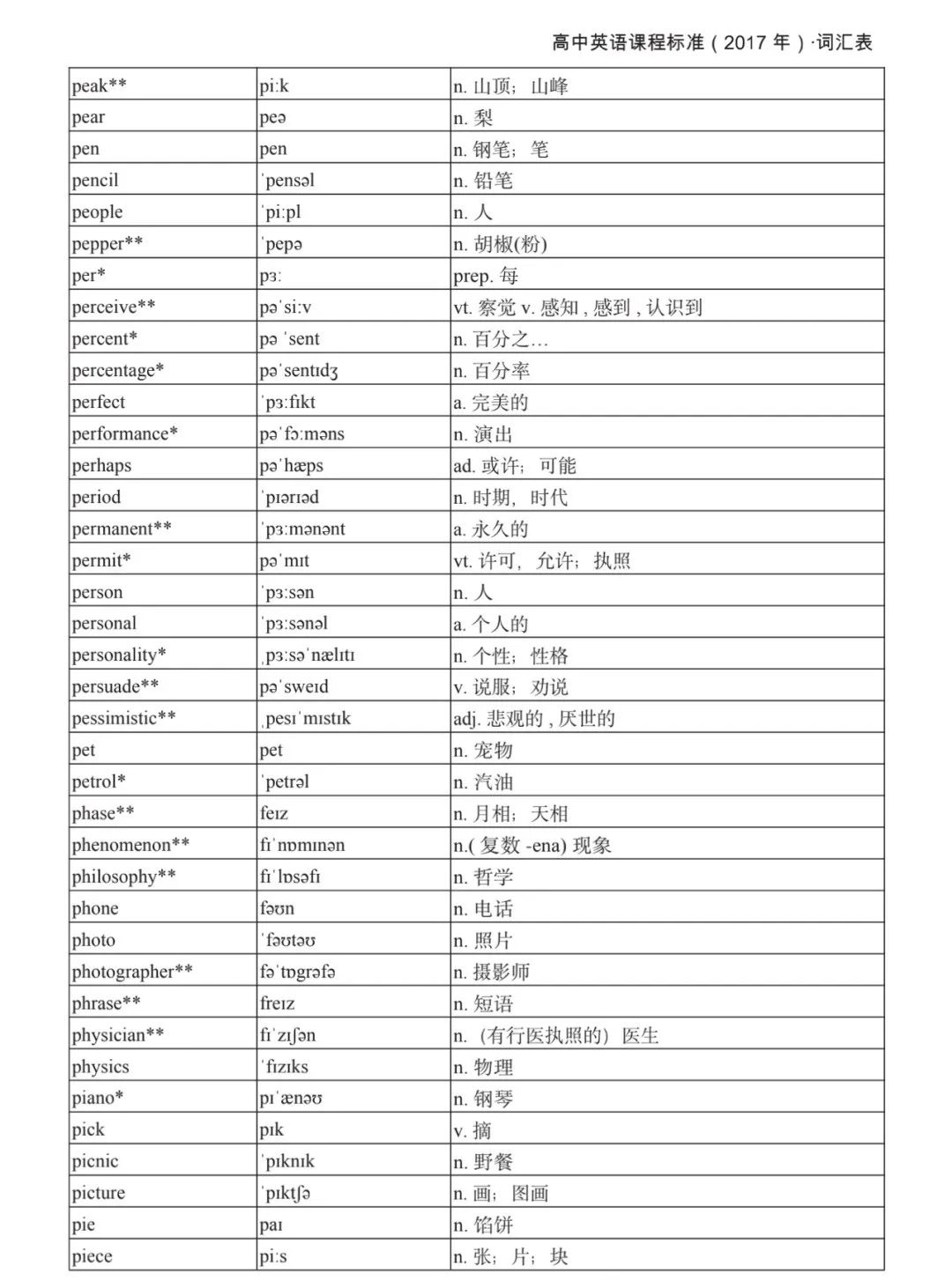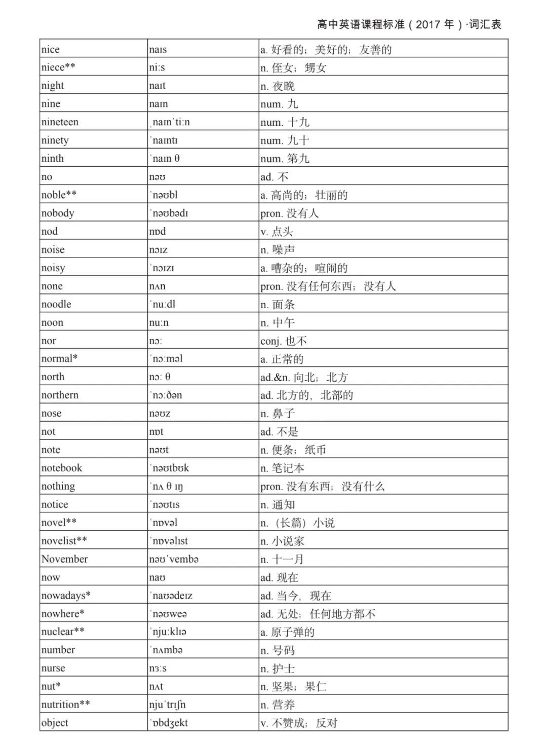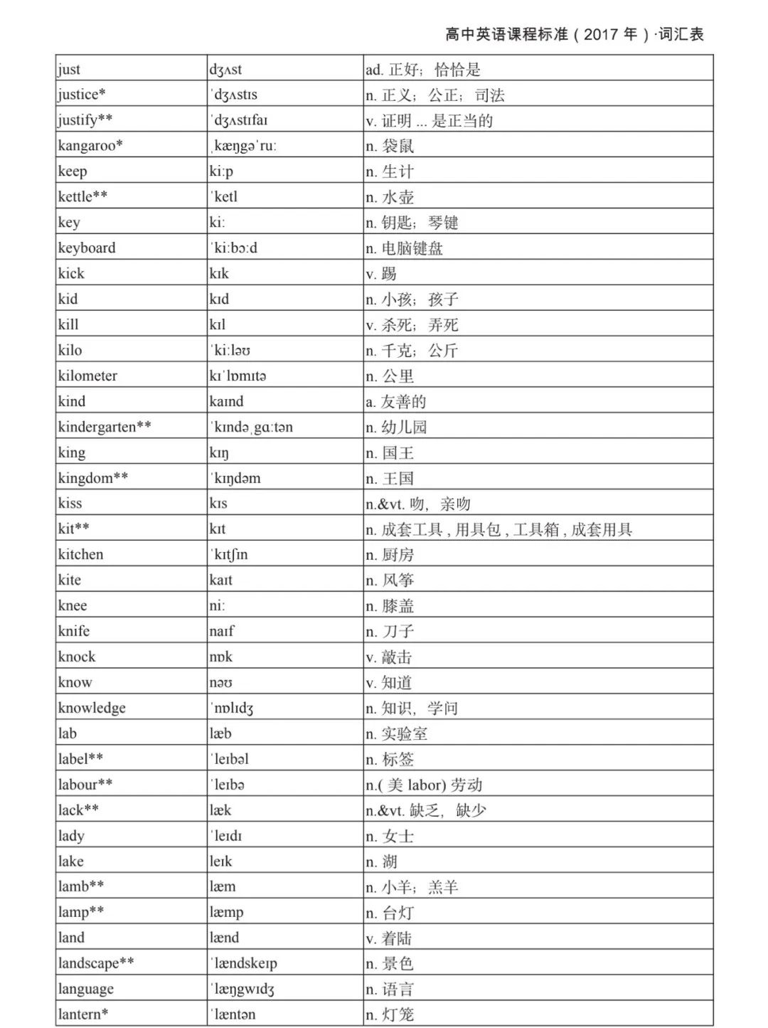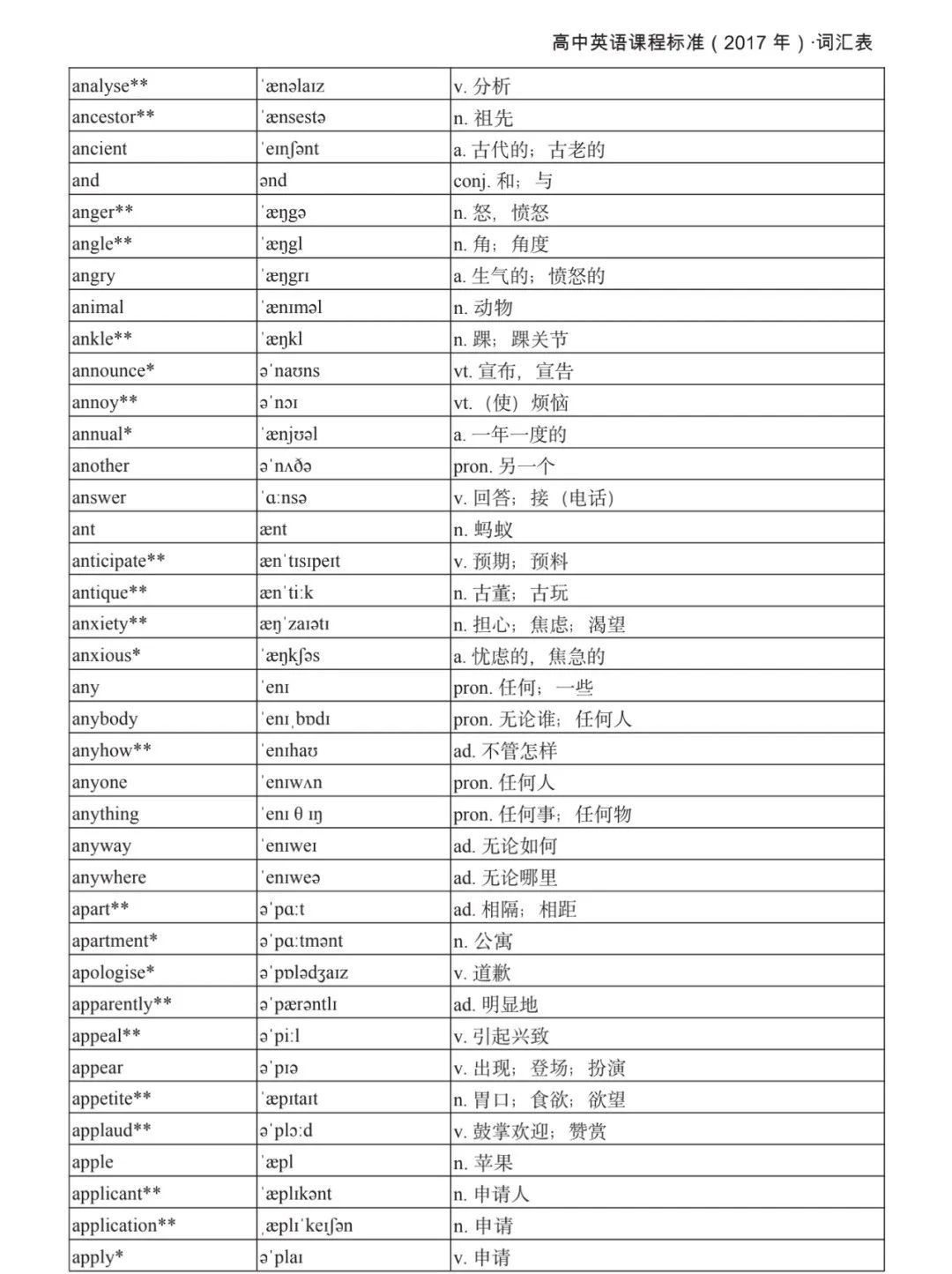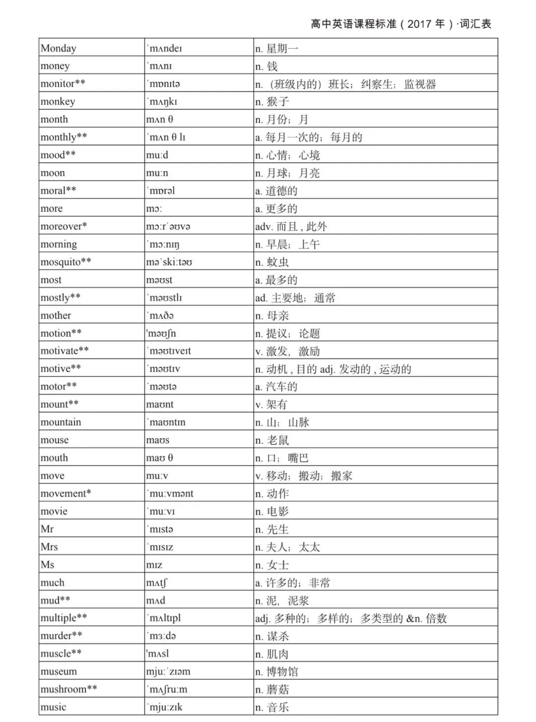 本詞匯表共收 3000 個(gè)單詞,含義務(wù)教育階段要求掌握的 1500 個(gè)單詞。高中英語必修課程應(yīng)學(xué)習(xí)和掌握 500 個(gè)單詞(表中加有一個(gè) * 號(hào)),累計(jì)達(dá) 2000。選擇性必修課程應(yīng)學(xué)習(xí)和掌握 1000 個(gè)單詞(表中加有兩個(gè) *號(hào)),累計(jì)達(dá) 3000。各地可根據(jù)實(shí)際情況在本詞匯表所收詞的基礎(chǔ)上,再選擇增加 200 個(gè)單詞。