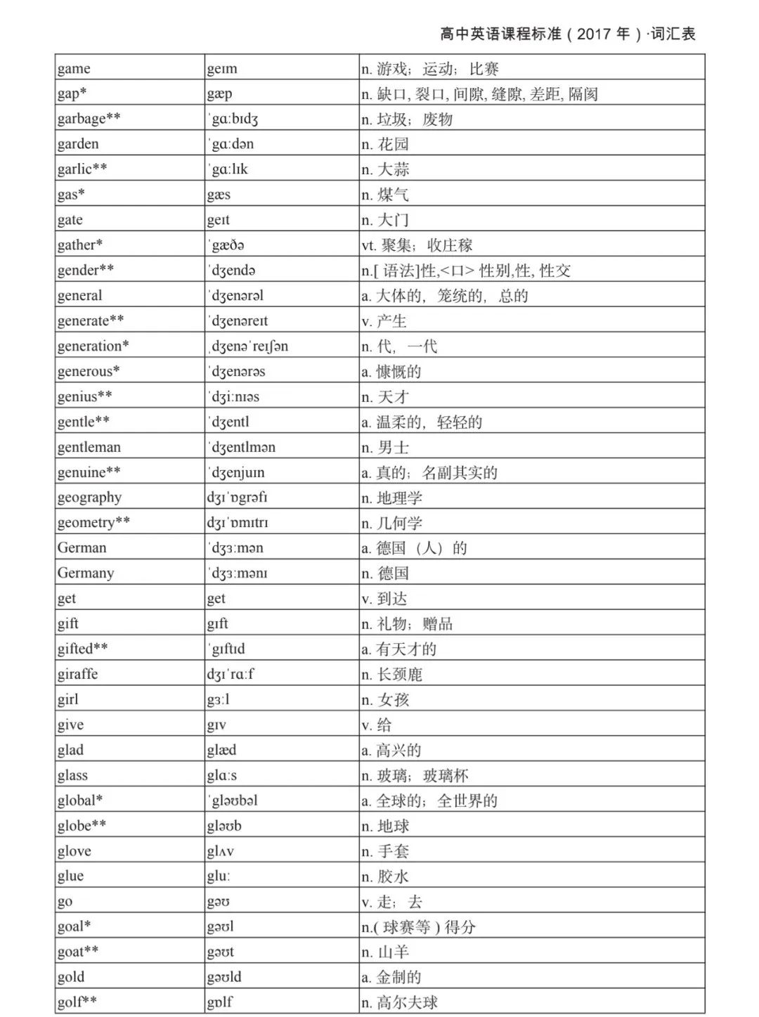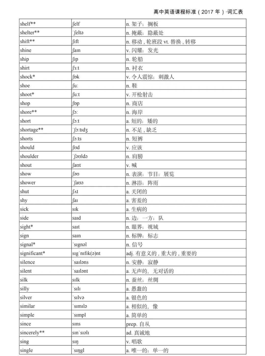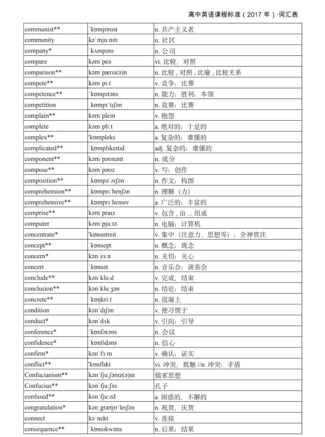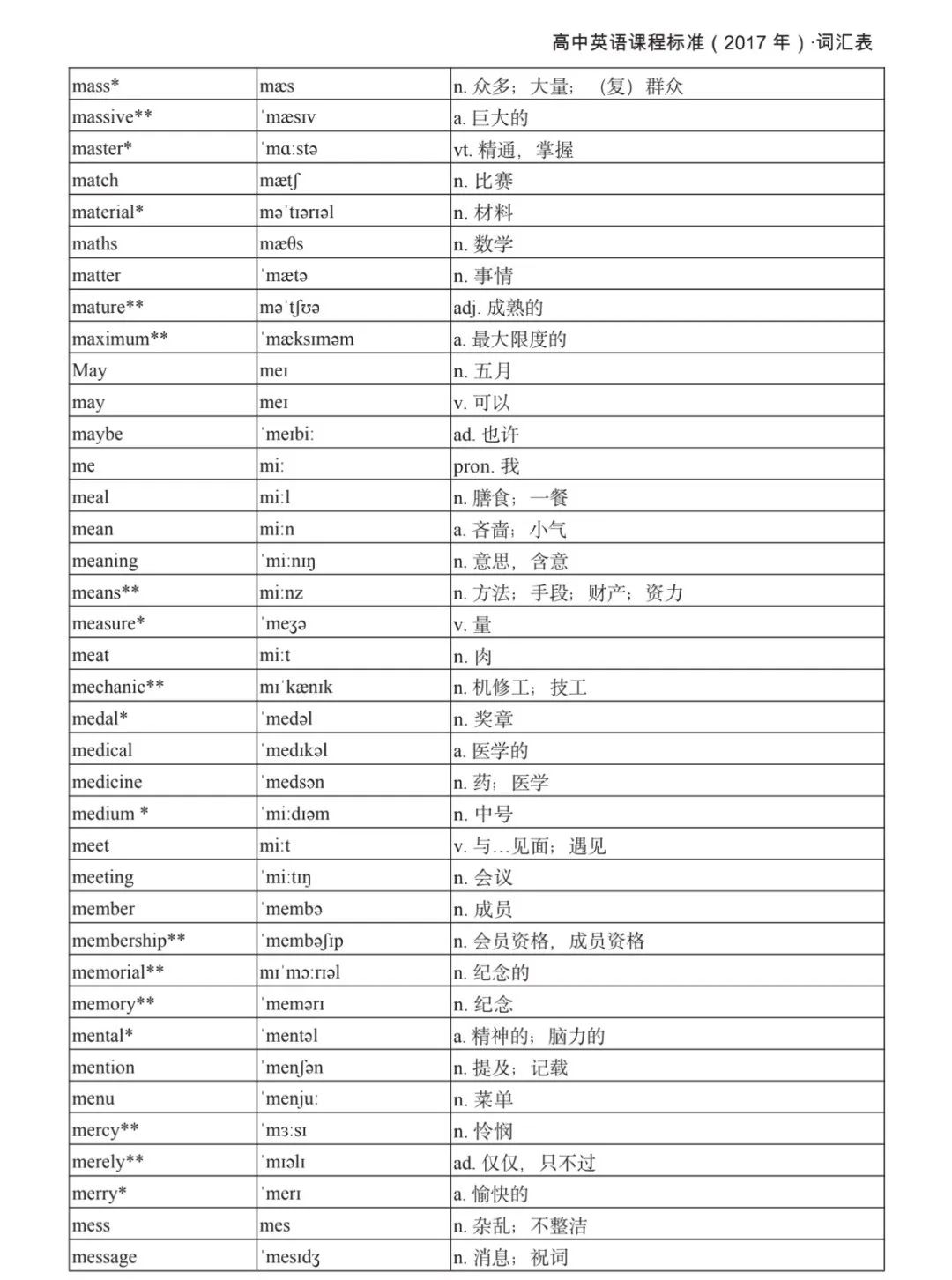 本詞匯表共收 3000 個(gè)單詞,含義務(wù)教育階段要求掌握的 1500 個(gè)單詞。高中英語必修課程應(yīng)學(xué)習(xí)和掌握 500 個(gè)單詞(表中加有一個(gè) * 號(hào)),累計(jì)達(dá) 2000。選擇性必修課程應(yīng)學(xué)習(xí)和掌握 1000 個(gè)單詞(表中加有兩個(gè) *號(hào)),累計(jì)達(dá) 3000。各地可根據(jù)實(shí)際情況在本詞匯表所收詞的基礎(chǔ)上,再選擇增加 200 個(gè)單詞。