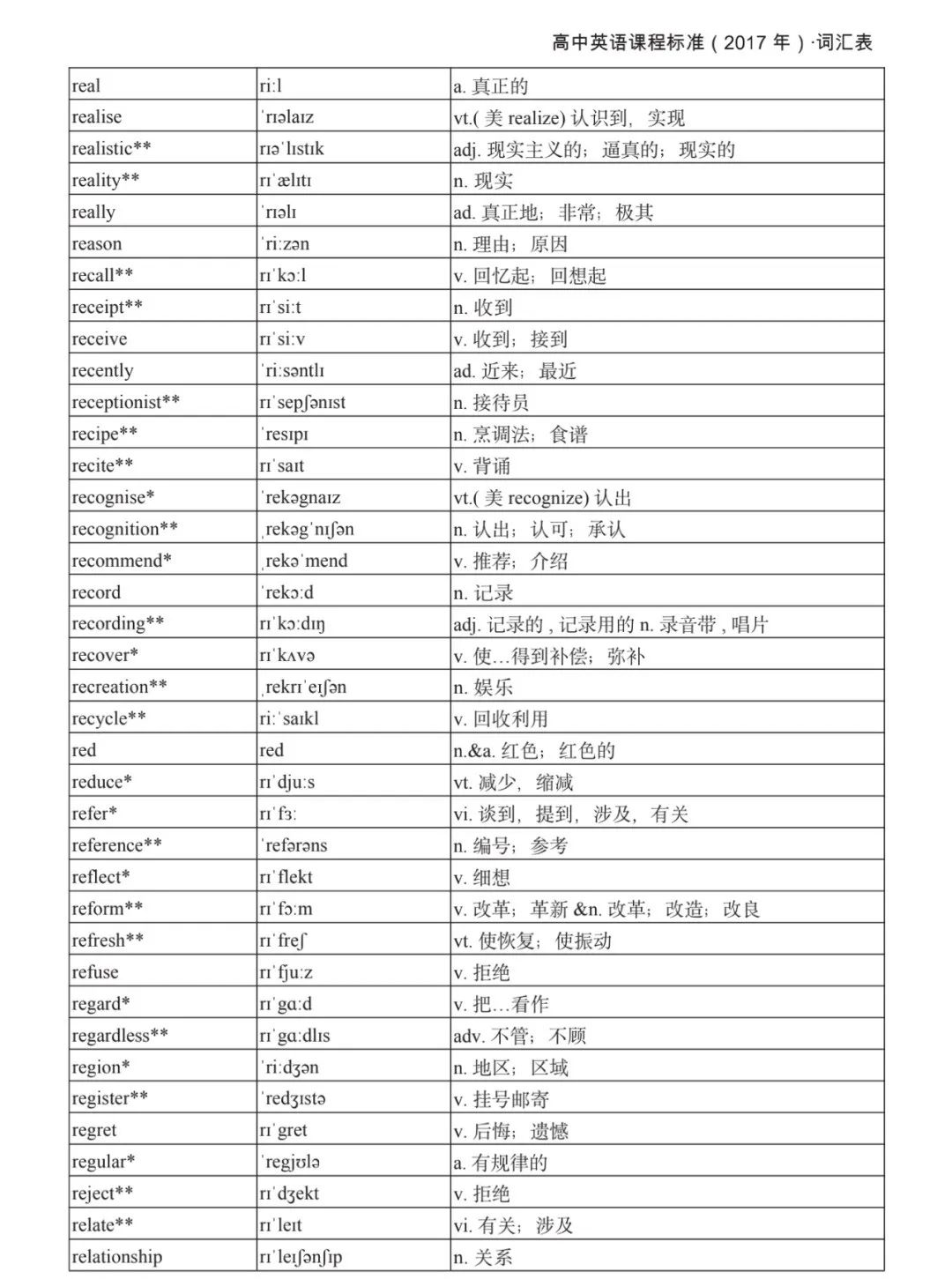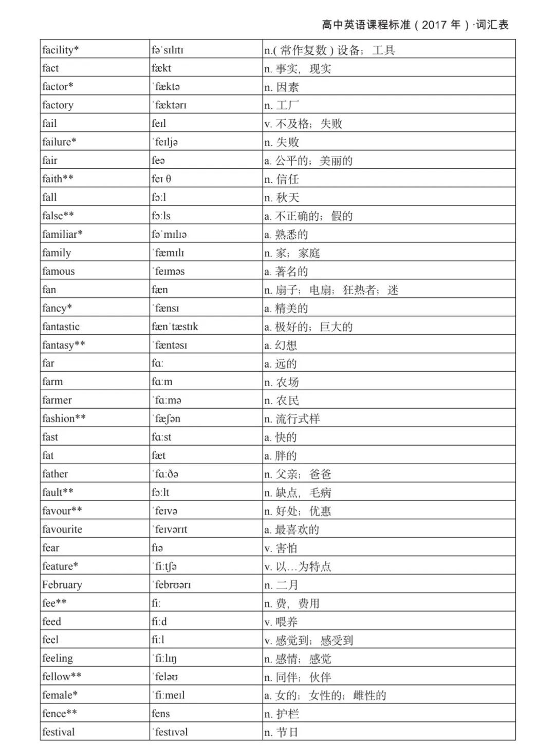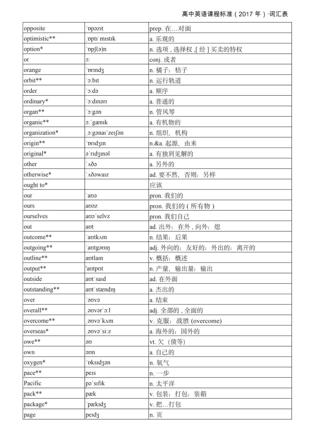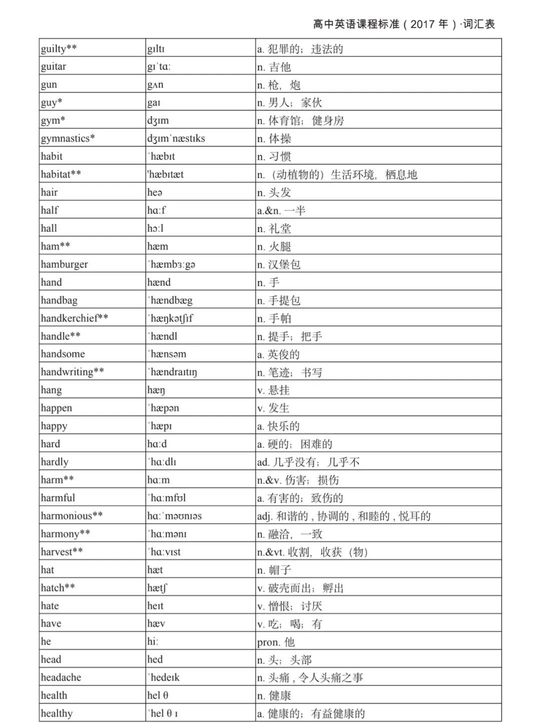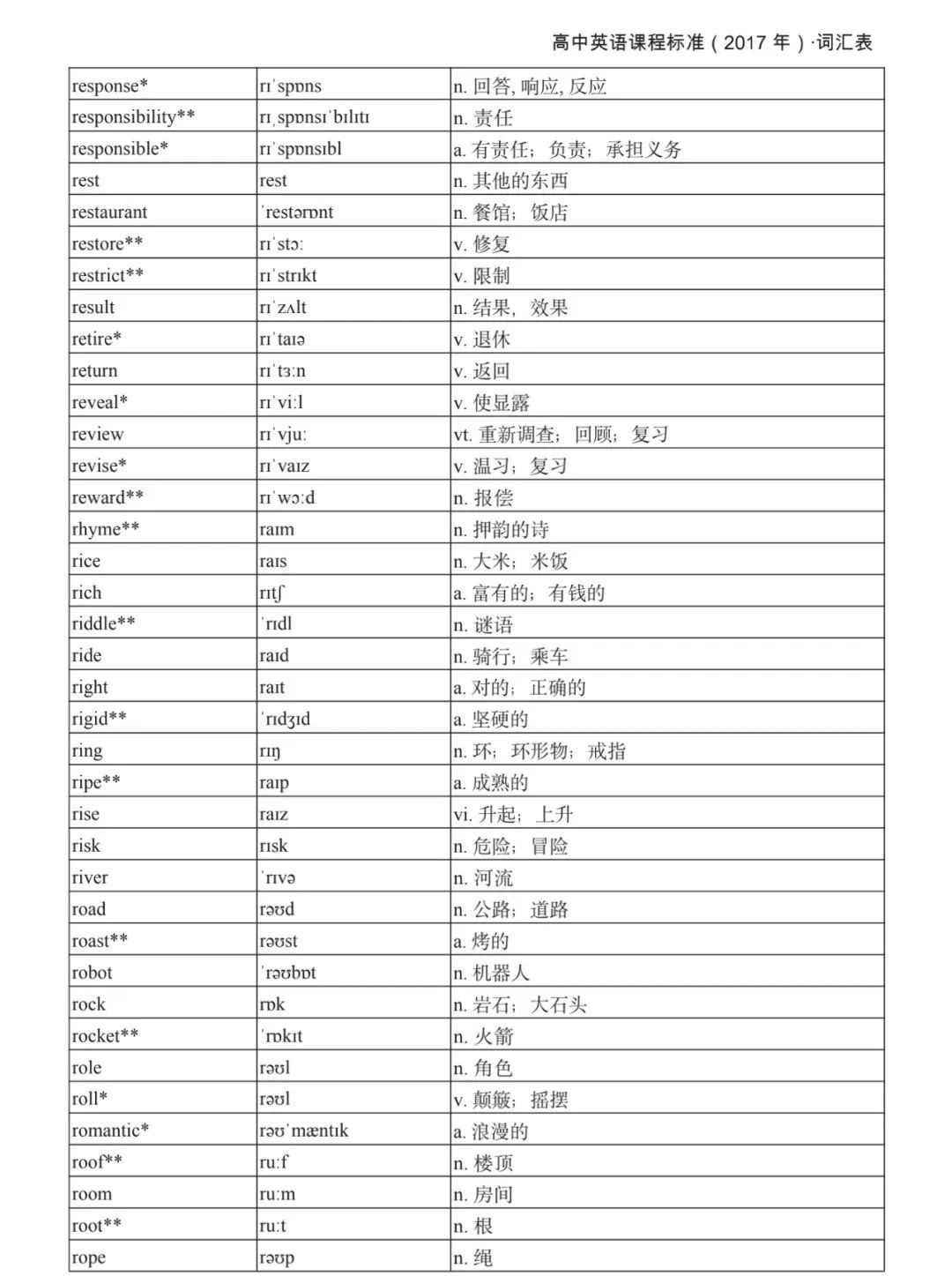 本詞匯表共收 3000 個(gè)單詞,含義務(wù)教育階段要求掌握的 1500 個(gè)單詞。高中英語必修課程應(yīng)學(xué)習(xí)和掌握 500 個(gè)單詞(表中加有一個(gè) * 號(hào)),累計(jì)達(dá) 2000。選擇性必修課程應(yīng)學(xué)習(xí)和掌握 1000 個(gè)單詞(表中加有兩個(gè) *號(hào)),累計(jì)達(dá) 3000。各地可根據(jù)實(shí)際情況在本詞匯表所收詞的基礎(chǔ)上,再選擇增加 200 個(gè)單詞。