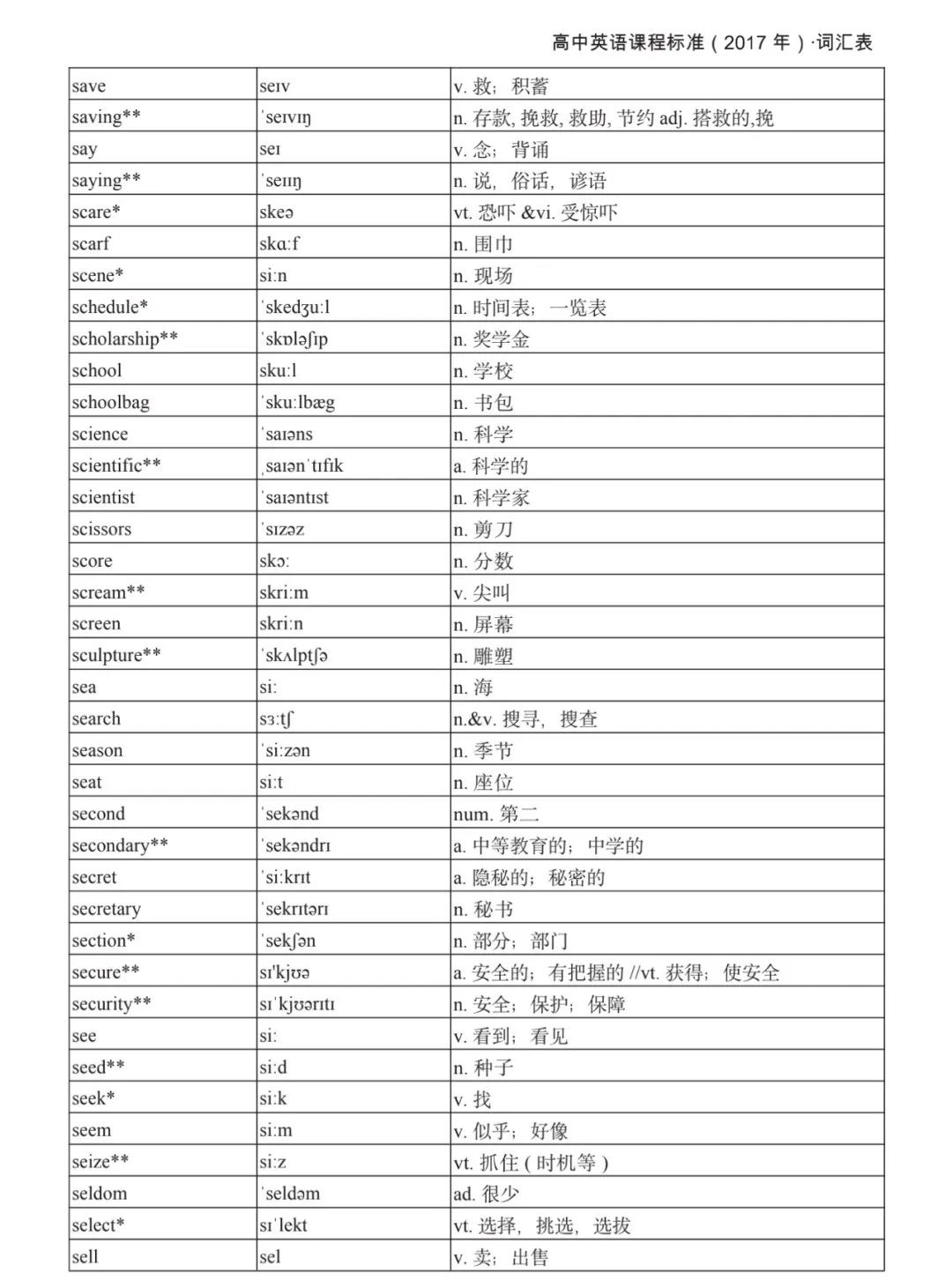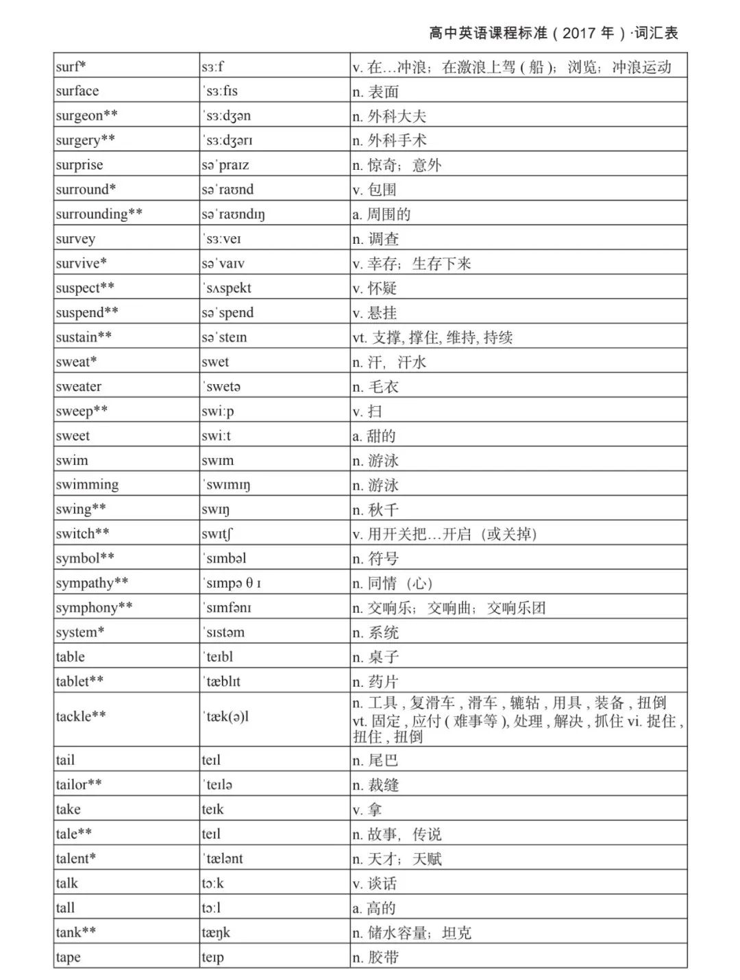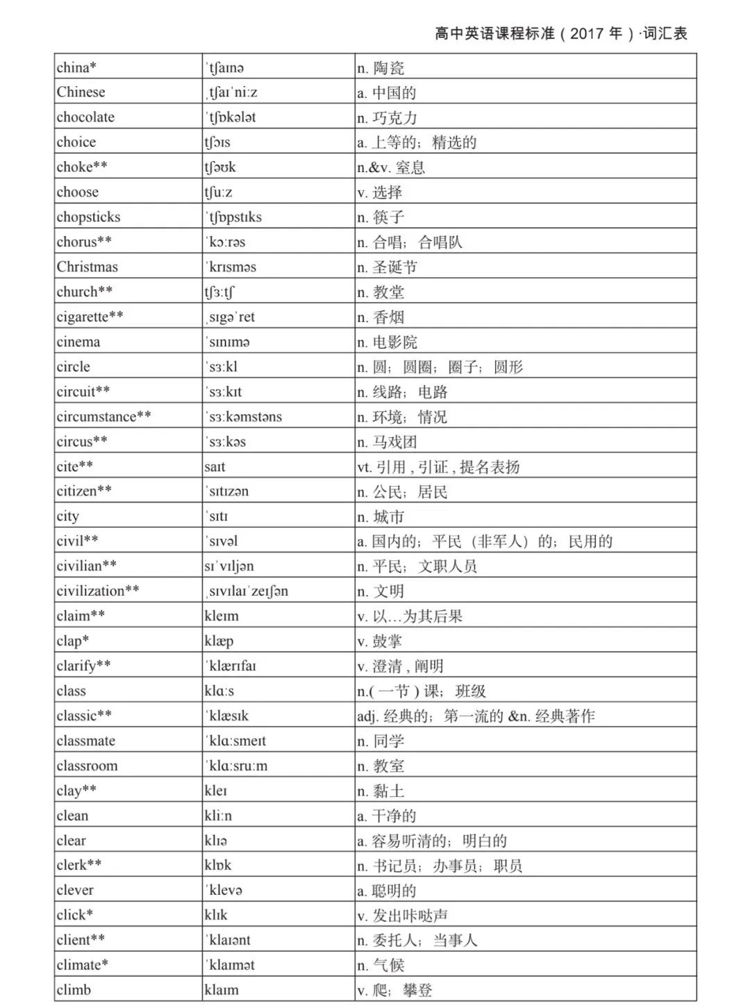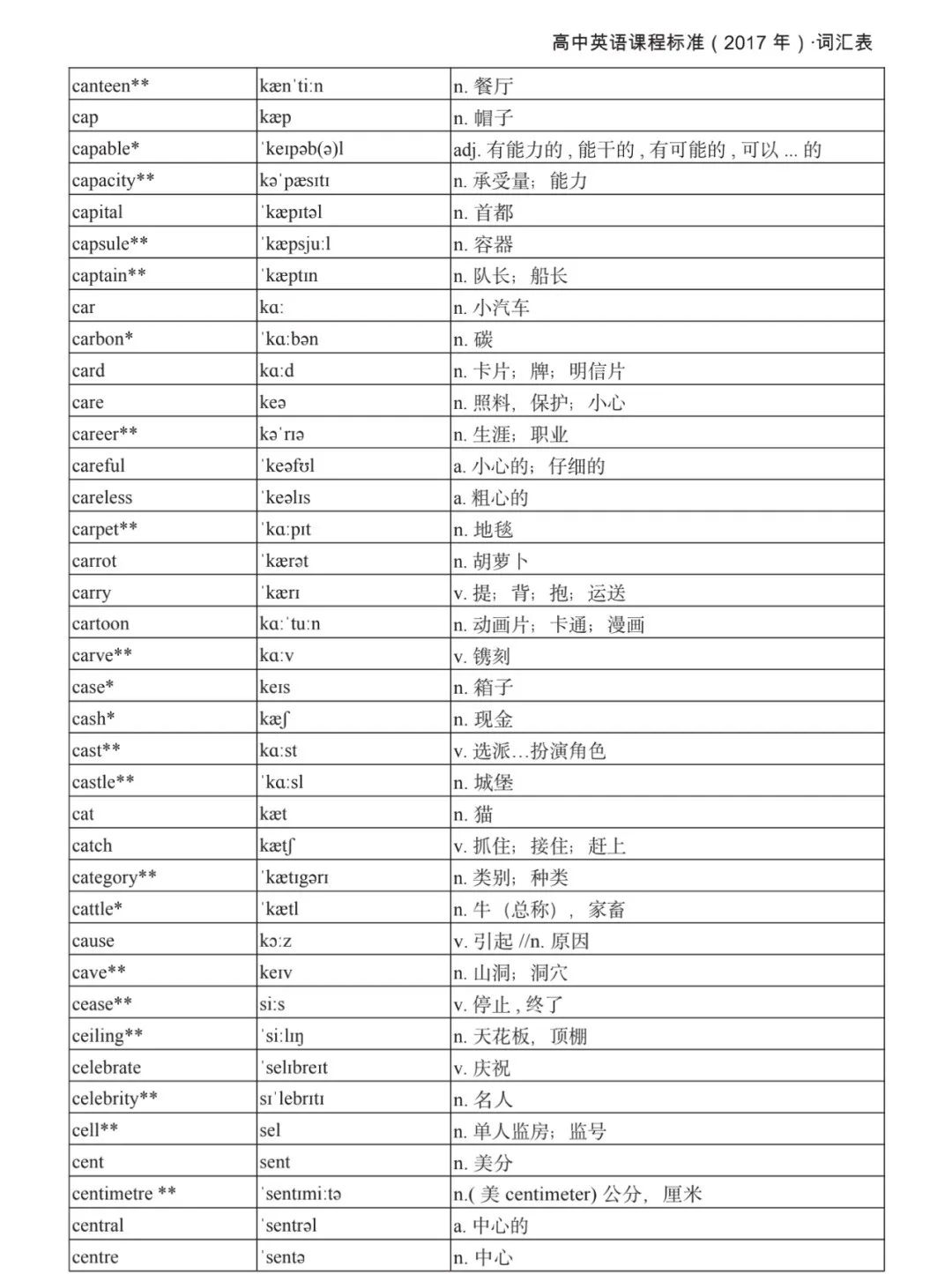 本詞匯表共收 3000 個(gè)單詞,含義務(wù)教育階段要求掌握的 1500 個(gè)單詞。高中英語必修課程應(yīng)學(xué)習(xí)和掌握 500 個(gè)單詞(表中加有一個(gè) * 號(hào)),累計(jì)達(dá) 2000。選擇性必修課程應(yīng)學(xué)習(xí)和掌握 1000 個(gè)單詞(表中加有兩個(gè) *號(hào)),累計(jì)達(dá) 3000。各地可根據(jù)實(shí)際情況在本詞匯表所收詞的基礎(chǔ)上,再選擇增加 200 個(gè)單詞。