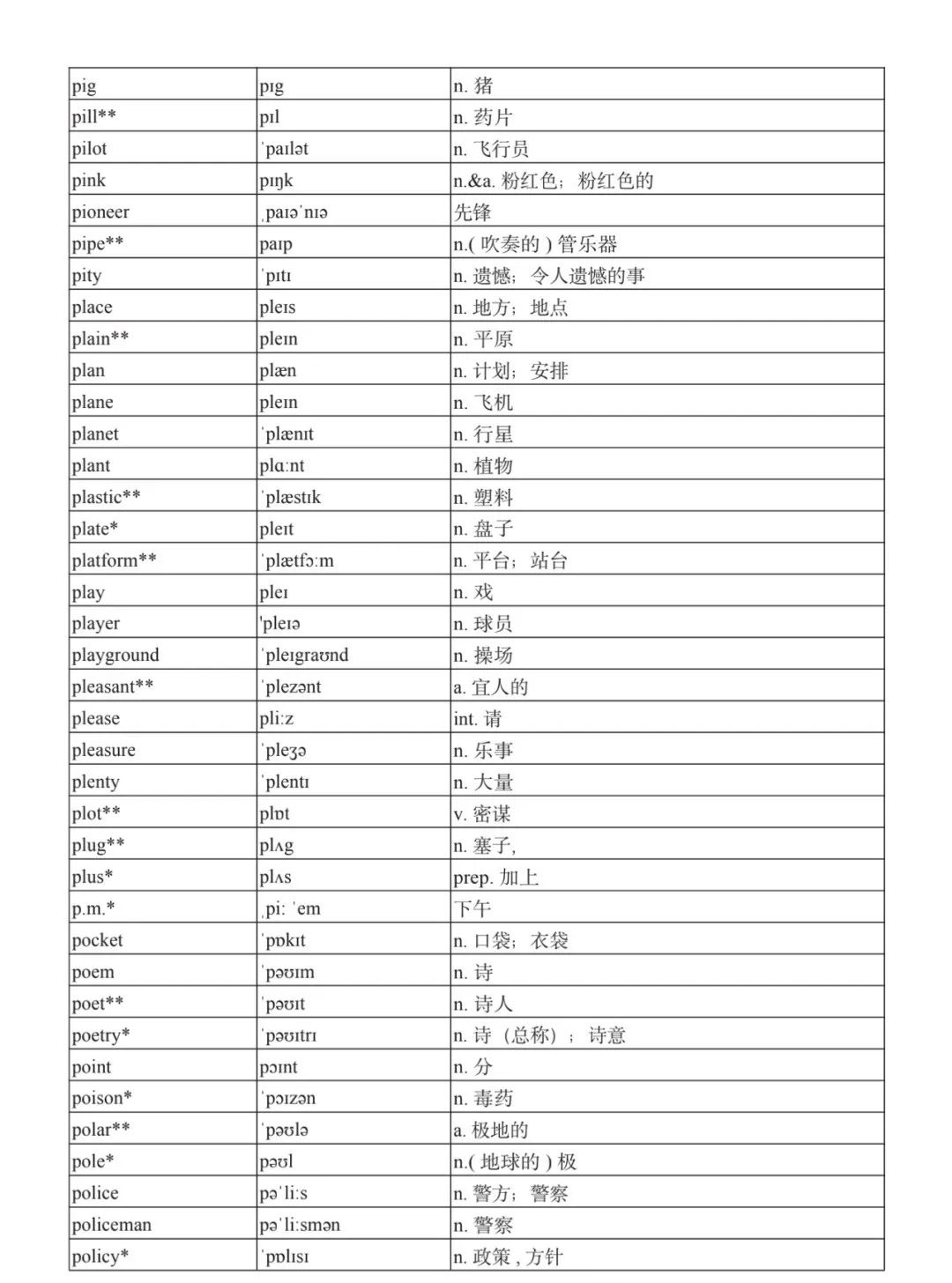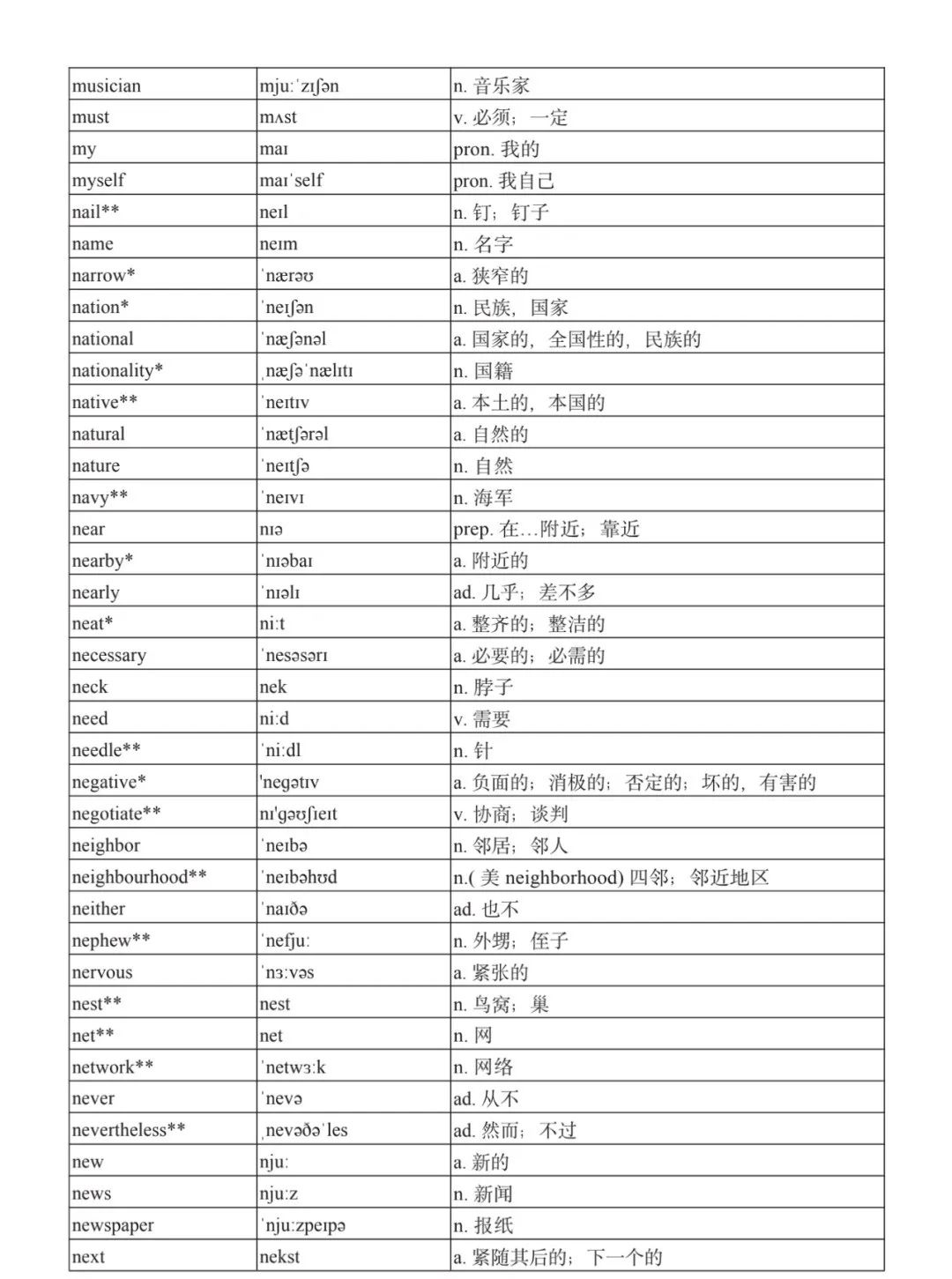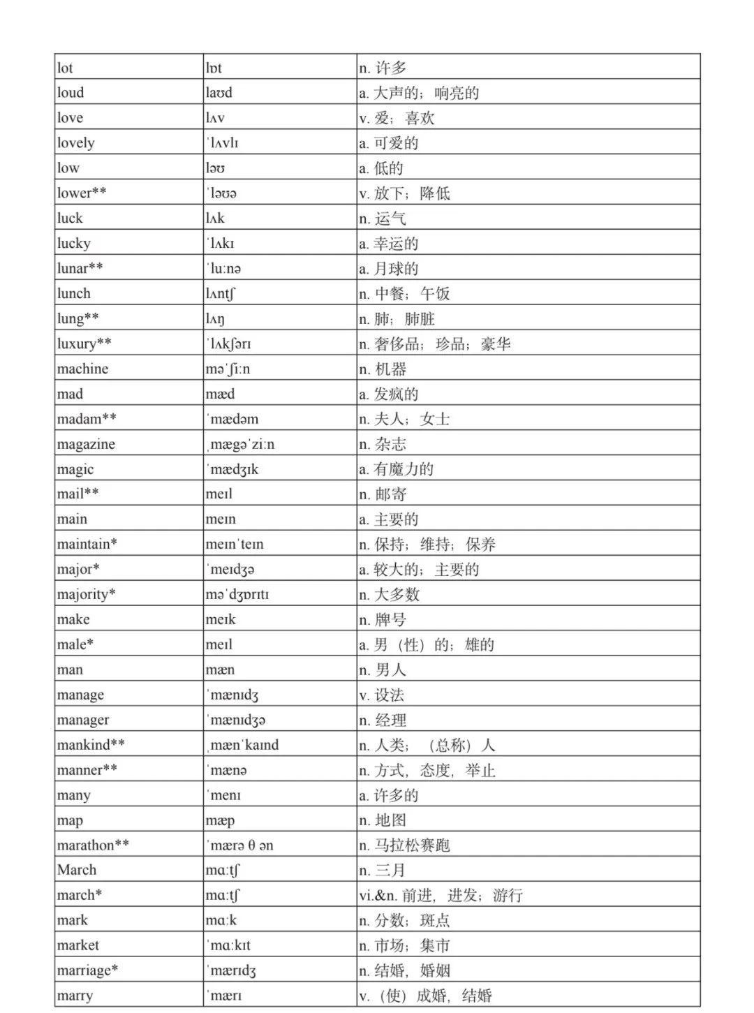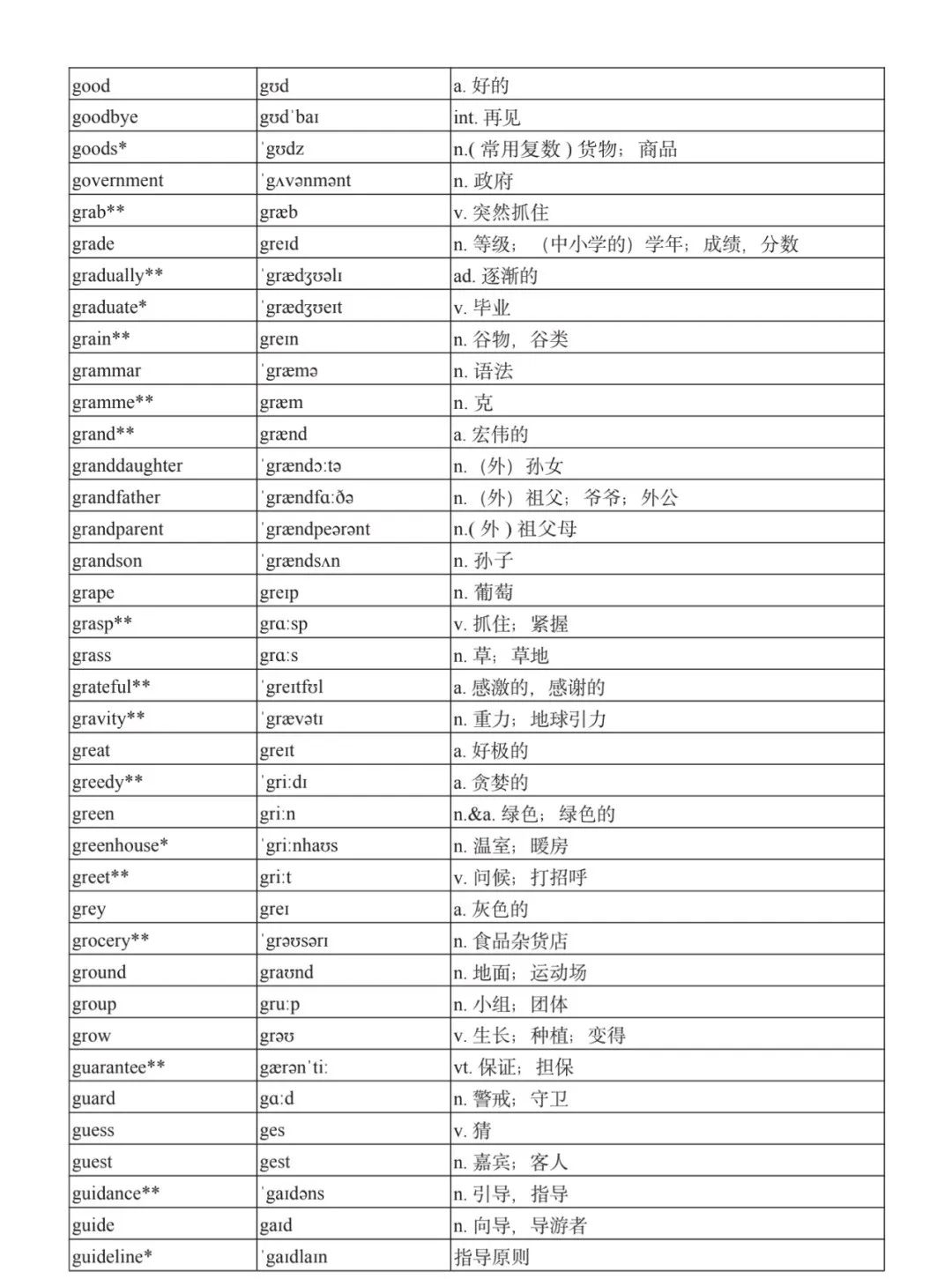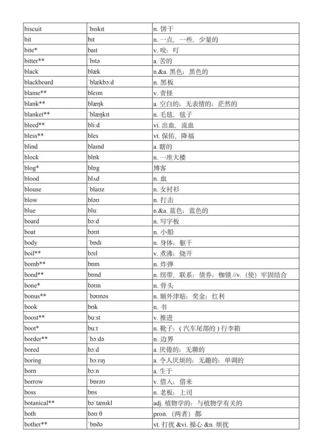 本詞匯表共收 3000 個(gè)單詞,含義務(wù)教育階段要求掌握的 1500 個(gè)單詞。高中英語必修課程應(yīng)學(xué)習(xí)和掌握 500 個(gè)單詞(表中加有一個(gè) * 號(hào)),累計(jì)達(dá) 2000。選擇性必修課程應(yīng)學(xué)習(xí)和掌握 1000 個(gè)單詞(表中加有兩個(gè) *號(hào)),累計(jì)達(dá) 3000。各地可根據(jù)實(shí)際情況在本詞匯表所收詞的基礎(chǔ)上,再選擇增加 200 個(gè)單詞。