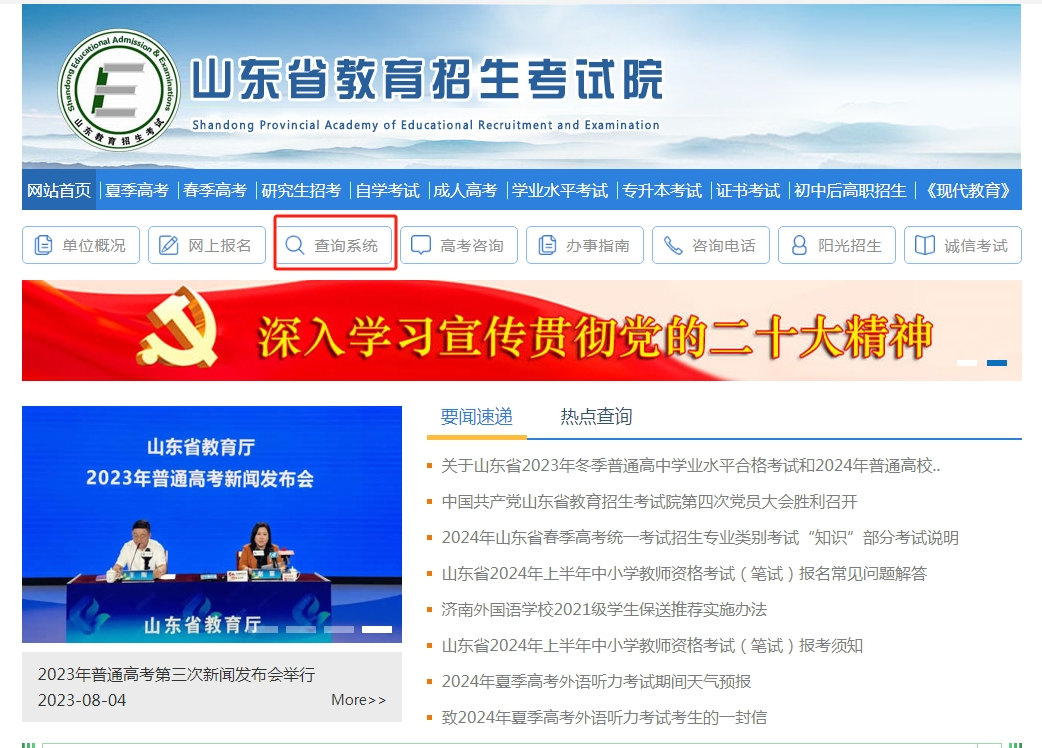 登錄山東省教育招生考試院官網(wǎng)(http://www.sdzk.cn/),在【查詢系統(tǒng)】頁面下查詢。