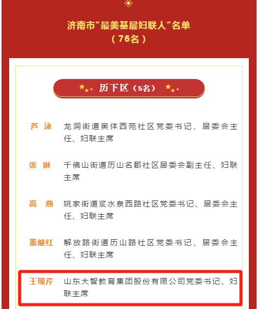近日,濟(jì)南市婦聯(lián)公布了“最美基層?jì)D聯(lián)人”名單,大智教育集團(tuán)黨委書記、婦聯(lián)主席王現(xiàn)芹被評為濟(jì)南市“最美基層?jì)D聯(lián)人”。