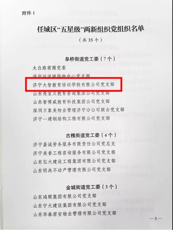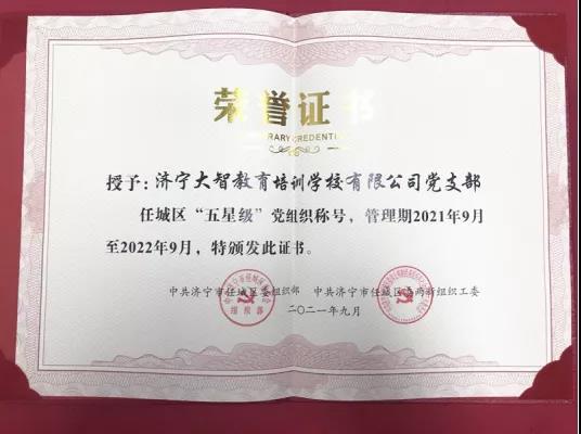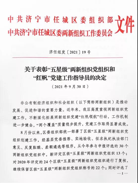 大智濟(jì)寧區(qū)域黨支部榮獲任城區(qū)“五星級”黨組織稱號