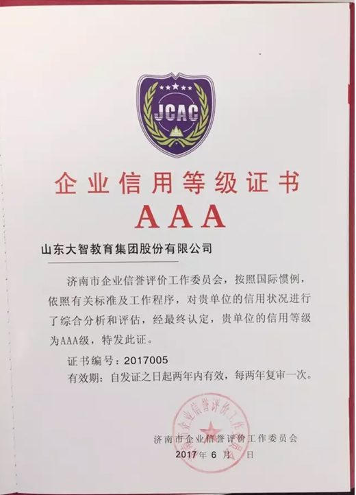 近日,經(jīng)濟南市企業(yè)信譽評價工作委員會嚴格審核與評估,大智教育集團被評定為企業(yè)信用等級AAA級,按照企業(yè)信用等級標準,AAA級為最高信用等級。