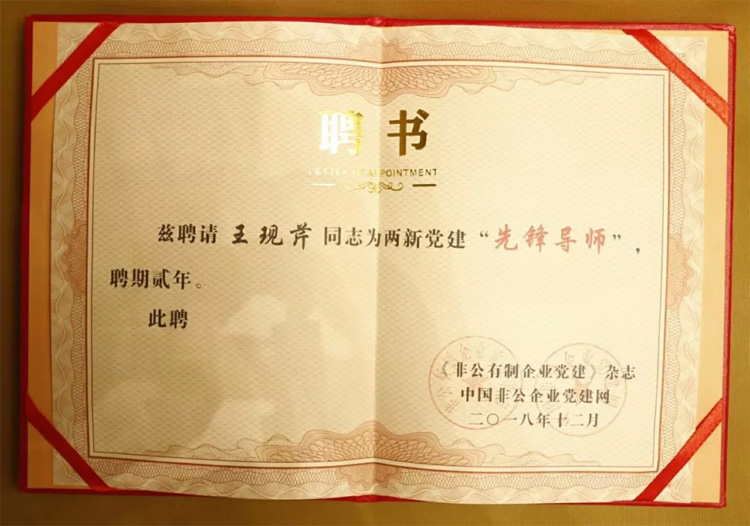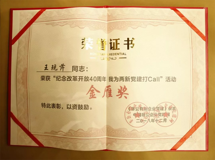 王現(xiàn)芹榮獲“紀(jì)念改革開(kāi)放40周年 我為兩新黨建打CALL”活動(dòng)金雁獎(jiǎng)并被聘為兩新黨建“先鋒導(dǎo)師”
