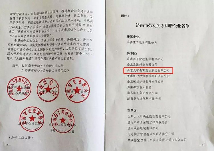 近日,濟南市人力資源和社會保障局、市總工會、市企業(yè)聯(lián)合會/企業(yè)家協(xié)會、市工商業(yè)聯(lián)合會聯(lián)合發(fā)文表彰先進,大智控股集團被命名為“濟南市勞動關(guān)系和諧企業(yè)”。