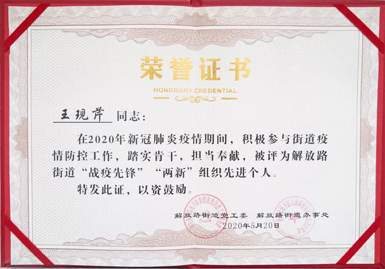 05月20日,由濟(jì)南市歷下區(qū)解放路街道黨工委和街道辦事處主辦,大智控股集團(tuán)承辦的解放路街道“戰(zhàn)疫先鋒”表彰活動(dòng)在歷下區(qū)文化和旅游局舉辦,現(xiàn)場(chǎng)對(duì)解放路街道新冠肺炎疫情期間涌現(xiàn)出來的先進(jìn)黨組織、先進(jìn)集體和先進(jìn)個(gè)人進(jìn)行表彰。濟(jì)南市歷下區(qū)委常委、宣傳部部長(zhǎng)王海清,副區(qū)長(zhǎng)趙琳,區(qū)委組織部副部長(zhǎng)、區(qū)公務(wù)員局局長(zhǎng)王軍凱,解放路街道黨工委書記仵愛之等參會(huì)。會(huì)上,大智榮獲“‘戰(zhàn)役先鋒’‘兩新’組織”先進(jìn)單位、“‘戰(zhàn)役先鋒’‘兩新’組織”先進(jìn)個(gè)人、“‘戰(zhàn)役先鋒’志愿服務(wù)先進(jìn)集體”等系列榮譽(yù)。