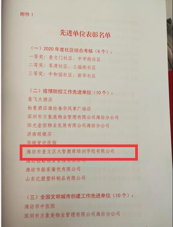 2020年新冠肺炎疫情爆發(fā)以來,大智教育集團黨委積極響應疫情防控要求,扎實開展各項疫情防控措施,近日,大智濰坊區(qū)域獲得“疫情防控工作先進單位”榮譽稱號。