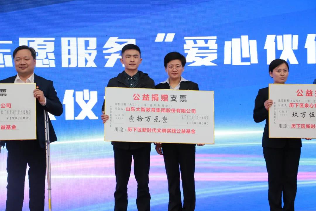 愛心伙伴項目捐助認領(lǐng)儀式上,山東大智教育集團股份有限公司等五組愛心伙伴企業(yè)負責人為志愿服務(wù)團隊代表進行捐贈。其中大智教育集團為歷下區(qū)新時代文明實踐公益基金捐贈10萬元。