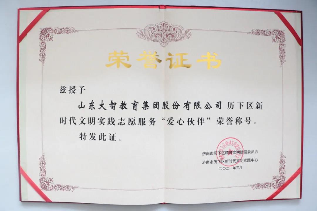 濟南市歷下區(qū)精神建設(shè)委員會和濟南市歷下區(qū)新時代文明實踐中心授予山東大智教育集團有限公司歷下區(qū)新時代文明實踐志愿服務(wù)“愛心伙伴”稱號,并授予了榮譽獎杯及證書。