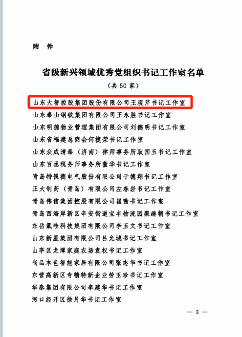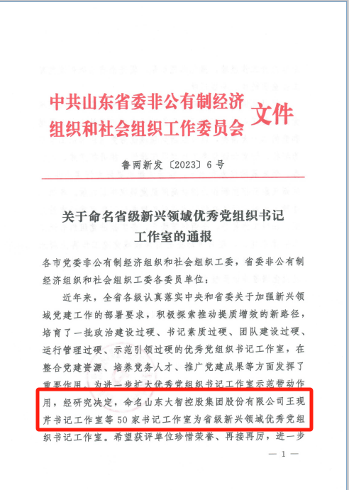 為充分發(fā)揮新興領(lǐng)域優(yōu)秀黨組織書記工作室示范帶動作用,近日,中共山東省委非公有制經(jīng)濟組織和社會組織工作委員會發(fā)布《關(guān)于命名省級新興領(lǐng)域優(yōu)秀黨組織書記工作室的通報》,授予山東大智控股集團股份有限公司王現(xiàn)芹書記工作室等50家書記工作室為省級新興領(lǐng)域優(yōu)秀黨組織書記工作室。