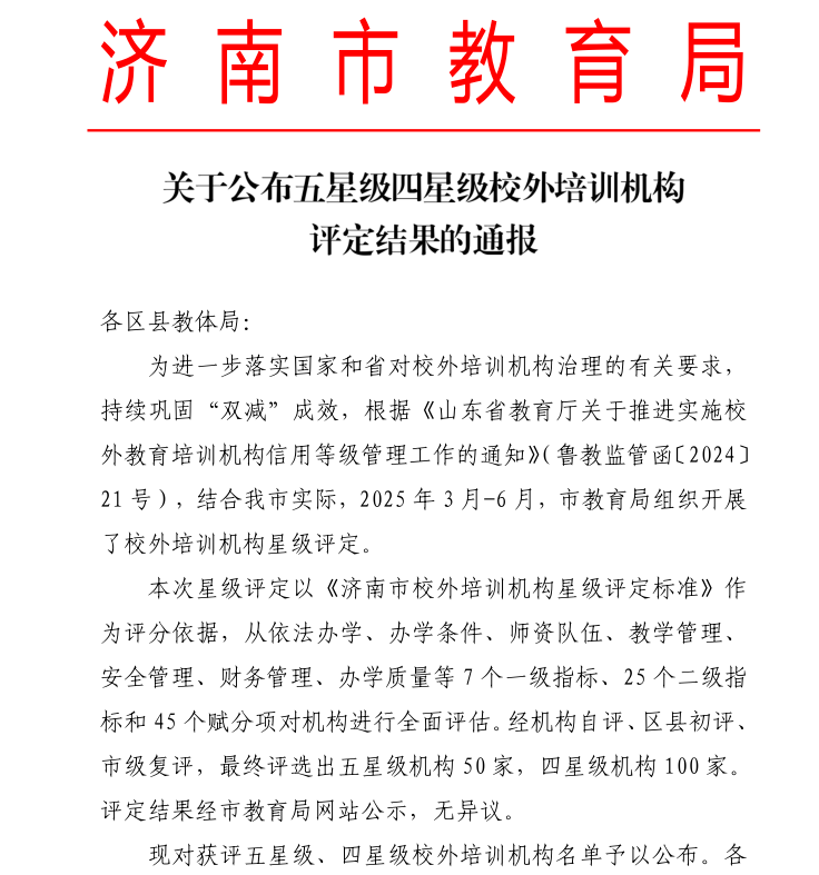 近日,濟(jì)南市教育局發(fā)布《關(guān)于公布五星級四星級校外培訓(xùn)機(jī)構(gòu)評定結(jié)果的通報(bào)》,大智12所分校憑借規(guī)范辦學(xué)、優(yōu)質(zhì)服務(wù)和卓越教學(xué)成果上榜,彰顯了深耕...