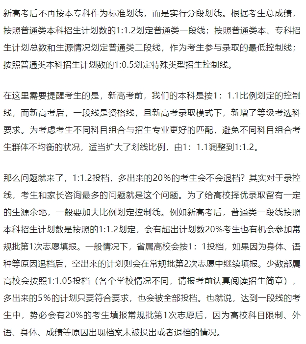 現(xiàn)在我省考生報(bào)考科類分為普通類、藝術(shù)類、體育類三類,普通類常規(guī)批不再嚴(yán)格劃分本專科批次,淡化本??婆蔚母拍睿莿澏ǖ囊欢尉€、二段線僅作為分段填報(bào)志愿的資格線,打破了人為給招生院校和專業(yè)分批分等的既有格局,促使所有院校專業(yè)同臺競爭。