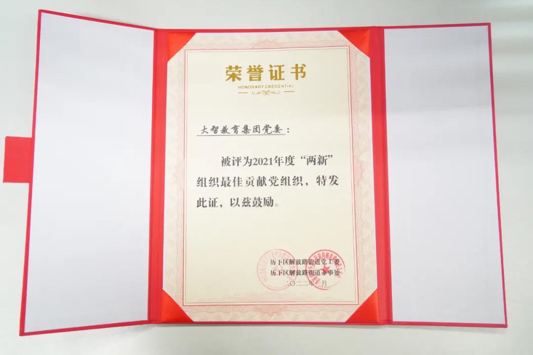 近日,大智教育集團黨委被評為2021年度“兩新”組織最佳貢獻(xiàn)黨組織。