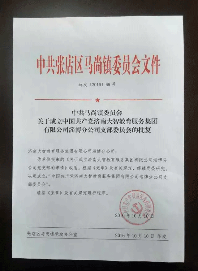 2016年10月10日,中共張店區(qū)馬尚鎮(zhèn)委員會(huì)正式批復(fù)同意成立中共濟(jì)南大智教育服務(wù)集團(tuán)有限公司淄博分公司支部委員會(huì)。這是大智教育集團(tuán)繼臨沂分...