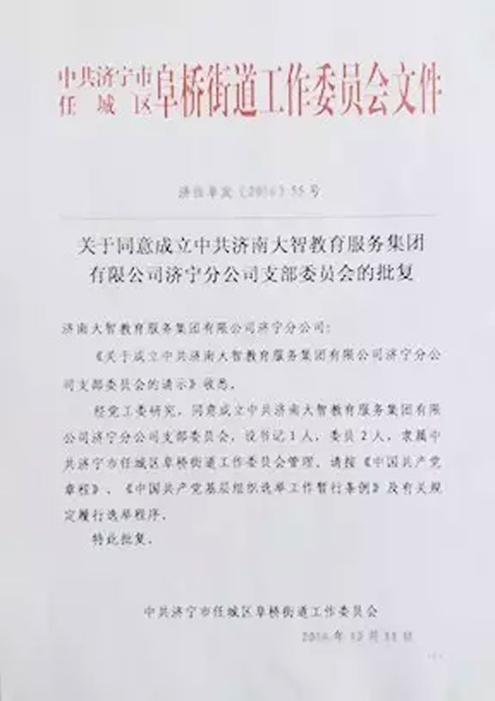 春暖花開,萬物復(fù)蘇之際,2017年大智黨建工作乘著春風(fēng)又添喜訊!03月07日,中共濟(jì)寧市任城區(qū)阜橋街道委員會(huì)正式批復(fù)同意成立中共濟(jì)南大智教育...