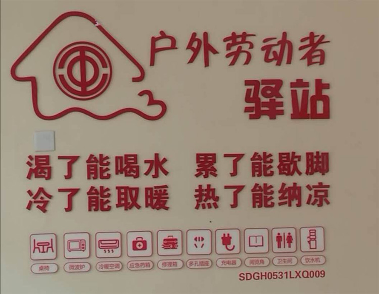 據(jù)悉,“戶外勞動(dòng)者驛站”是山東省總工會在全省范圍內(nèi)持續(xù)推動(dòng)建設(shè)的重點(diǎn)項(xiàng)目,旨在為廣大戶外勞動(dòng)者提供服務(wù)。驛站建成后,將以環(huán)衛(wèi)工、快遞員、協(xié)管員等戶外職工為主要服務(wù)對象,內(nèi)部設(shè)飲水機(jī)、空調(diào)、微波、沙發(fā)等生活設(shè)施,配備手機(jī)充電器、便民工具箱、醫(yī)療藥箱等,可有效解決戶外職工的飲水、避暑取暖、如廁、手機(jī)充電等生活實(shí)際需求,為廣大戶外勞動(dòng)者提供實(shí)實(shí)在在的溫暖與關(guān)懷。
