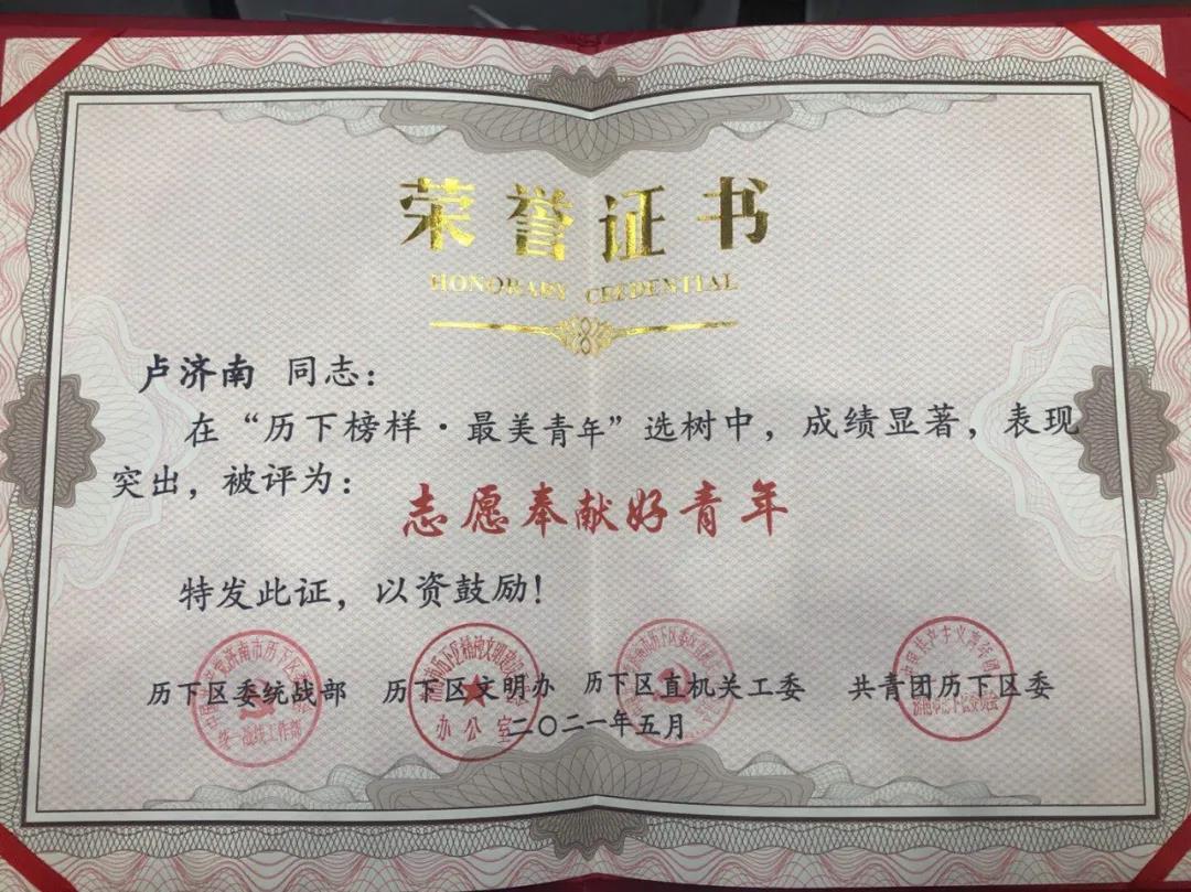 同時(shí),大智(濟(jì)南)智學(xué)智愛(ài)志愿服務(wù)隊(duì)領(lǐng)隊(duì)盧濟(jì)南榮獲“志愿奉獻(xiàn)好青年”榮譽(yù)稱號(hào)。