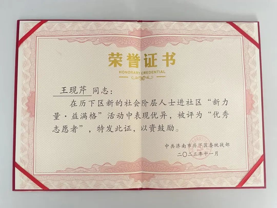 大智王現(xiàn)芹在“新力量?益滿格”活動(dòng)中榮獲“優(yōu)秀志愿者”稱號(hào)